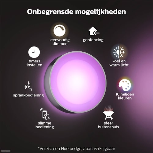 Mooie buiten daylo wandlamp van het bekende merk Philips Hue. Compatibel met onder andere Homey; Aeotec SmartThings; Google Assistent en Amazon Alexa.